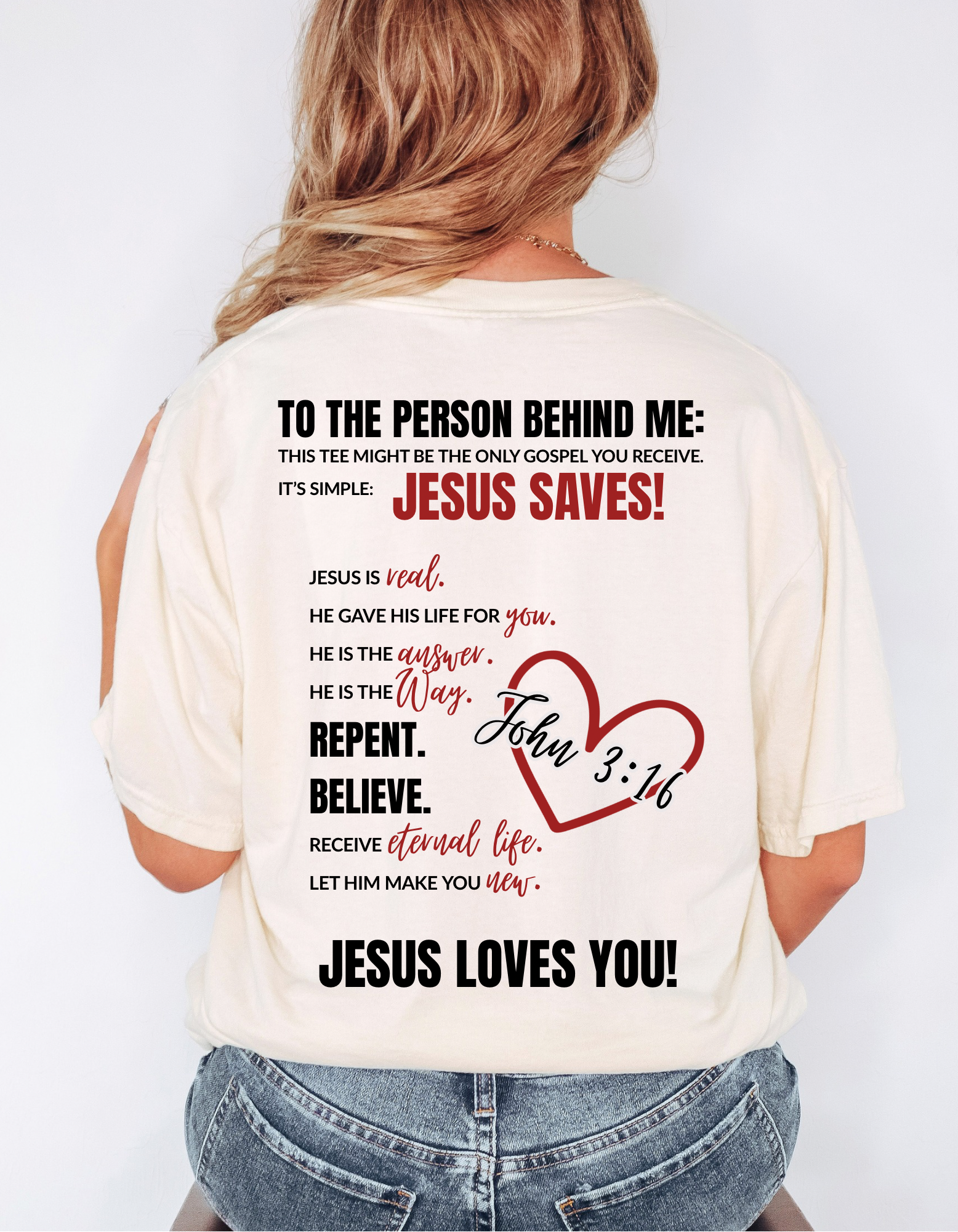 Make a bold statement of faith with this eye-catching tee. Featuring the powerful message "Jesus Saves" and the timeless scripture John 3:16 ❤️, this shirt is more than apparel — it’s a testimony.