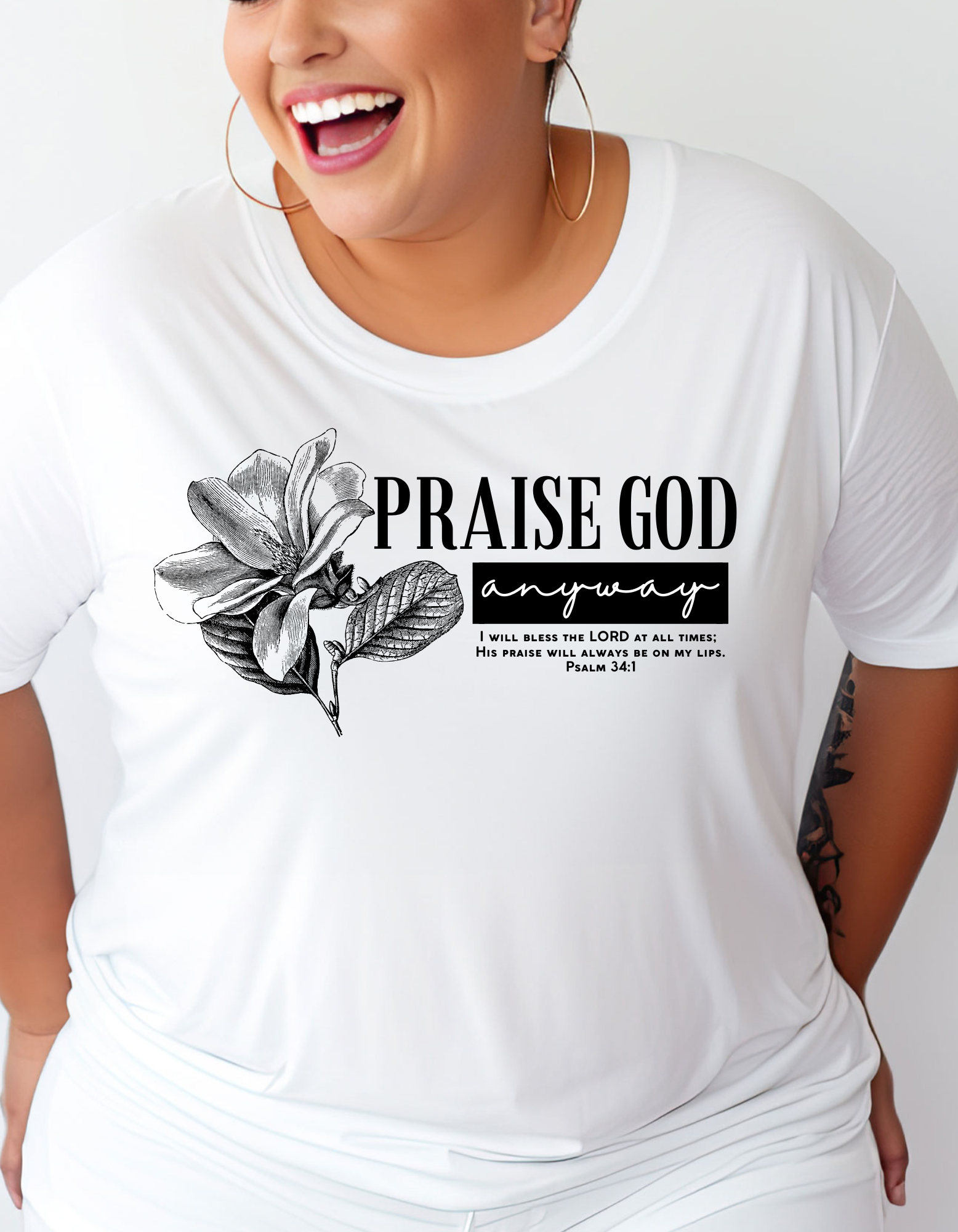 "Experience comfort and faith with our PRAISE GOD ANYWAY UNISEX TSHIRT. Featuring the powerful message of Psalm 34:1, this t-shirt reminds us to bless the Lord at all times. Unisex sizing and a soft blend provide a comfortable fit for all. (Ladies, size down for a more fitted look). Perfect for any occasion, let the Lord's praise continually be in your mouth with this t-shirt. Order now!"